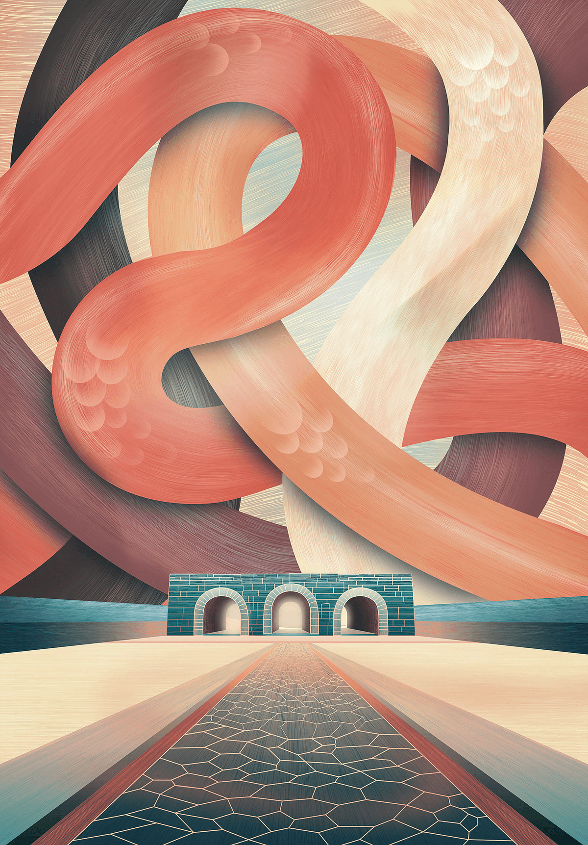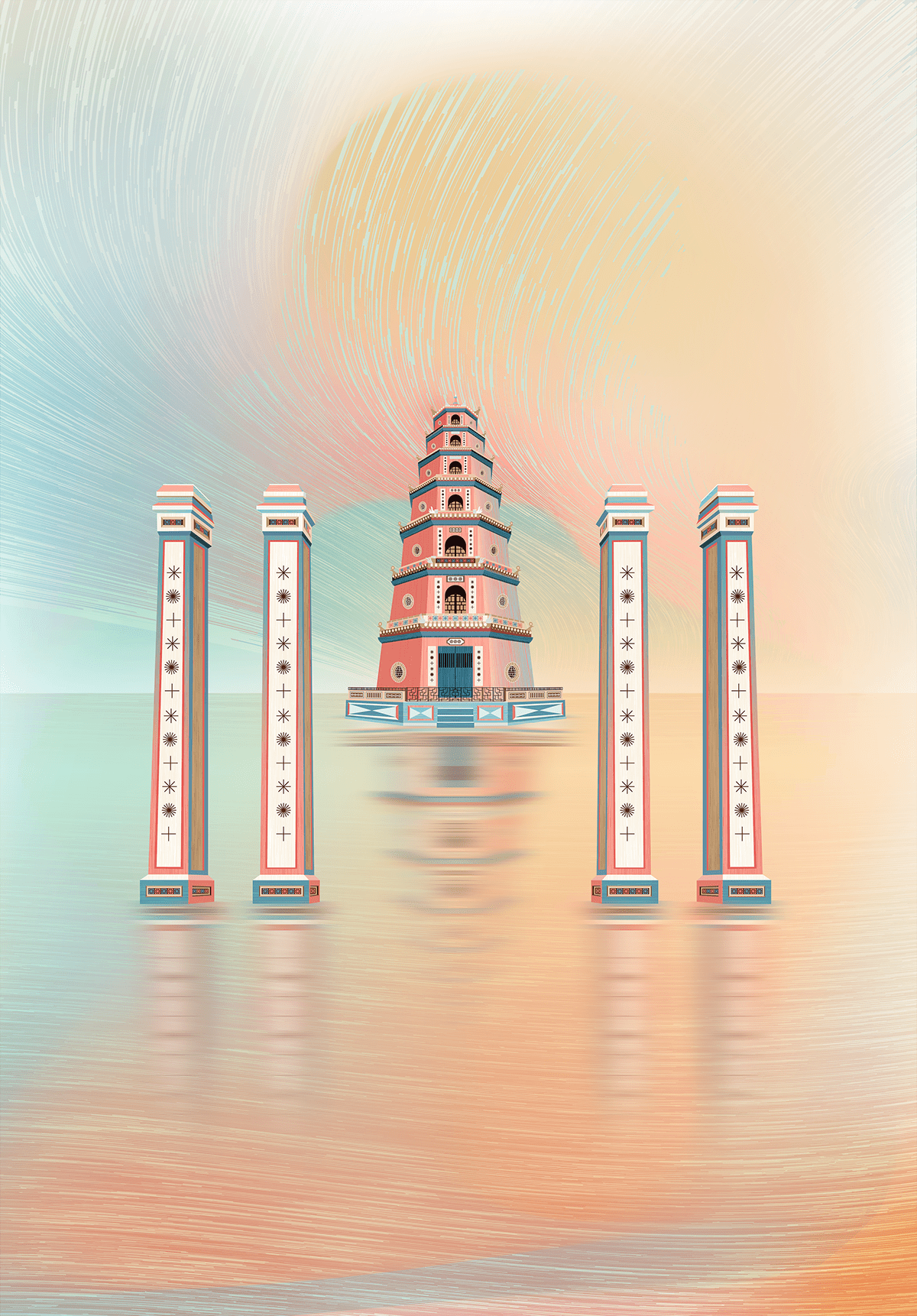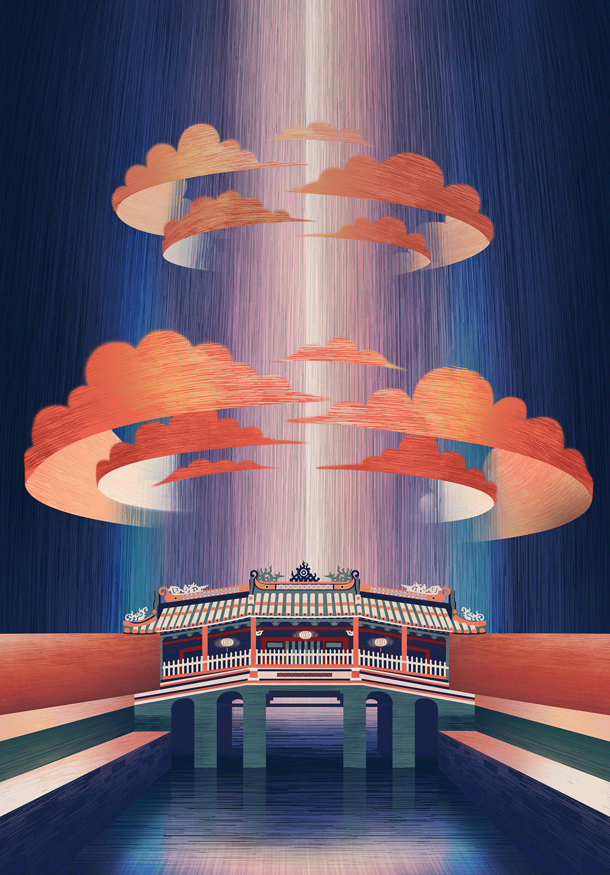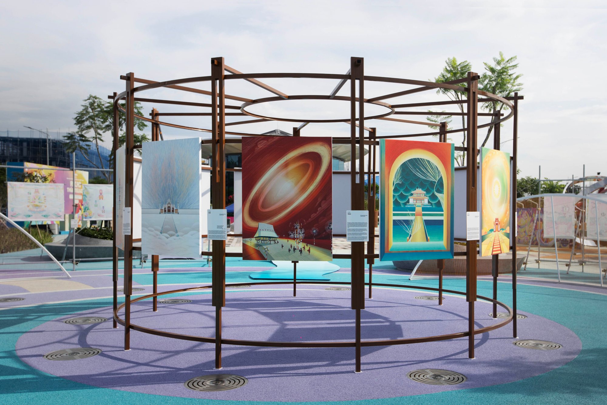 The artworks place these architectural elements within a surrealistic space, where folklore and cultural memories are reinterpreted through symbolic imagery such as sky, clouds, rivers, and seas. Together, they form a shared visual narrative that highlights the richness and diversity of Vietnamese cultural heritage.